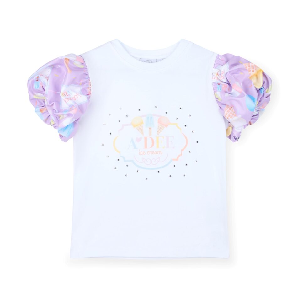 Zomerse zoetigheid! De A’Dee Sally set bestaat uit een witte top met schattige frill details, gecombineerd met een lila rok vol vrolijke ice cream print. De speelse ruches en luchtige stof maken deze set perfect voor zonnige dagen, feestjes of vakantieplezier.